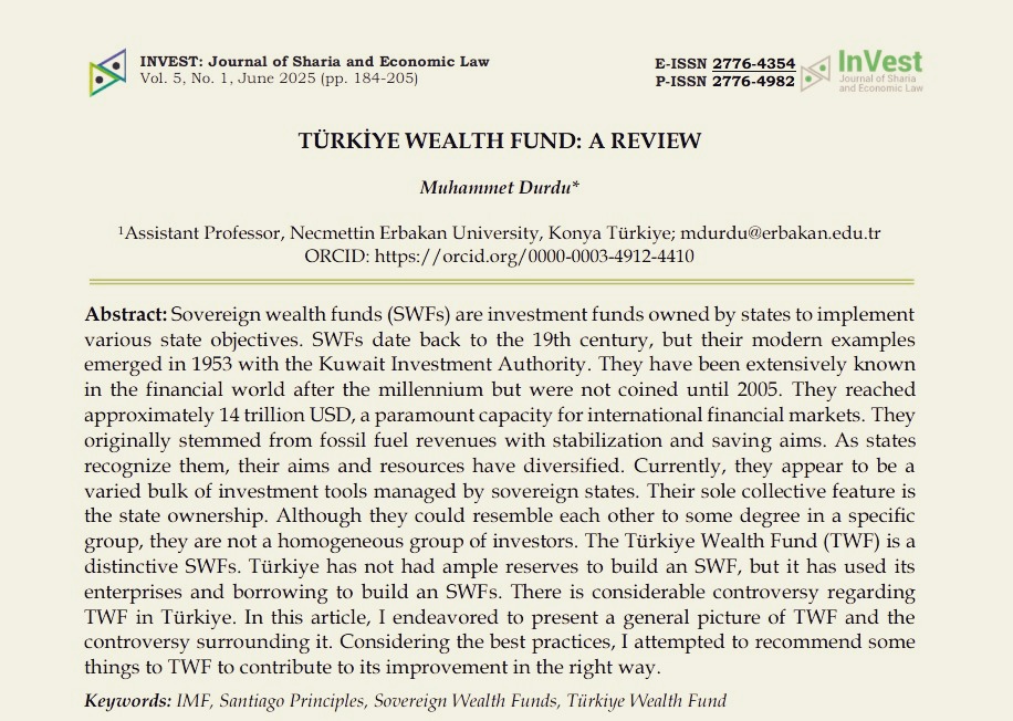 Vergi Hukuku Araştırma Grubu’nun üyesi Dr. Muhammet Durdu’nun “Türkiye Wealth Fund: A Review” isimli makalesi The INVEST Journal of Sharia and Economic Law Dergisinin Vol. 5 No. 1 (2025) sayısında yayımlanmıştır.