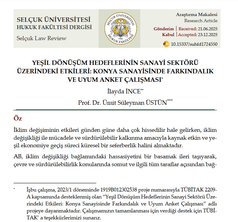 Vergi Hukuku Araştırma Grubu’nun üyesi Baş Araştırmacı Dr. Ümit Süleyman Üstün’ün, İlayda İnce ile birlikte kaleme aldıkları “Yeşil Dönüşüm Hedeflerinin Sanayi Sektörü Üzerindeki Etkileri: Konya Sanayisinde Farkındalık ve Uyum Anket Çalışması” isimli makalesi Selçuk Üniversitesi Hukuk Fakültesi Dergisinin 2025/Aralık sayısında yayımlanmıştır.